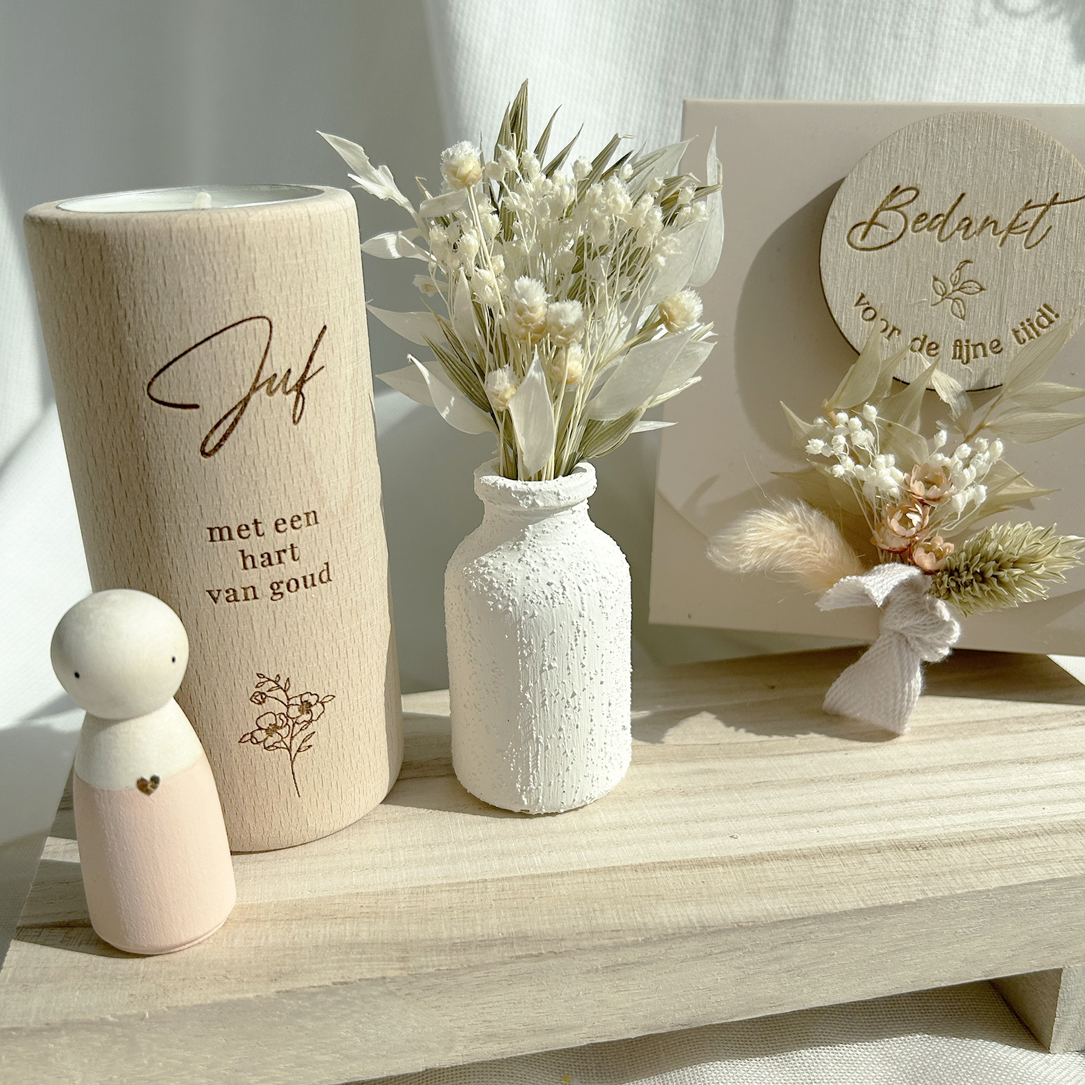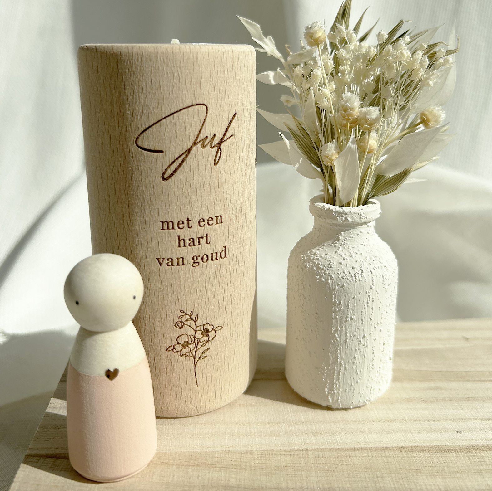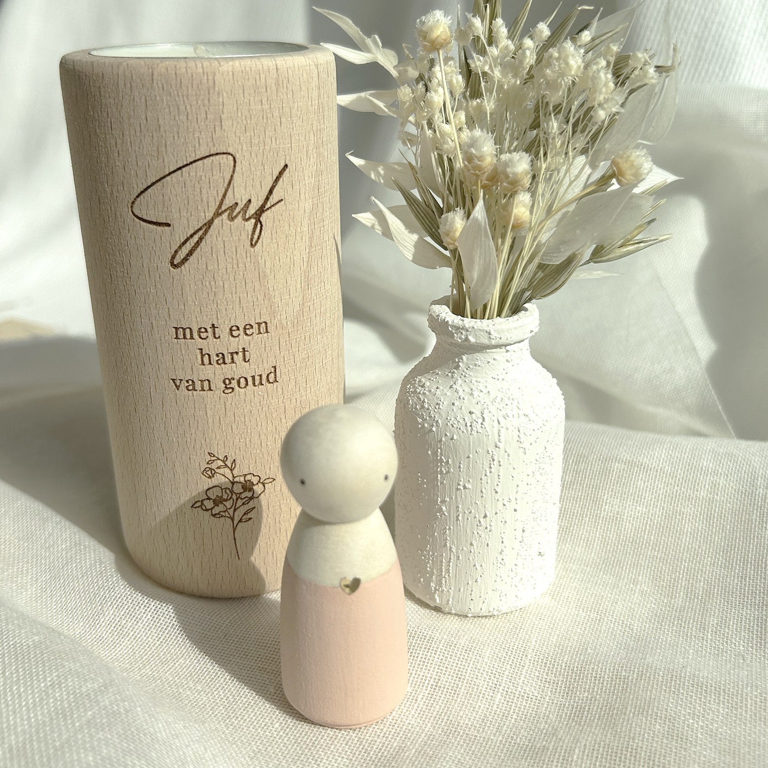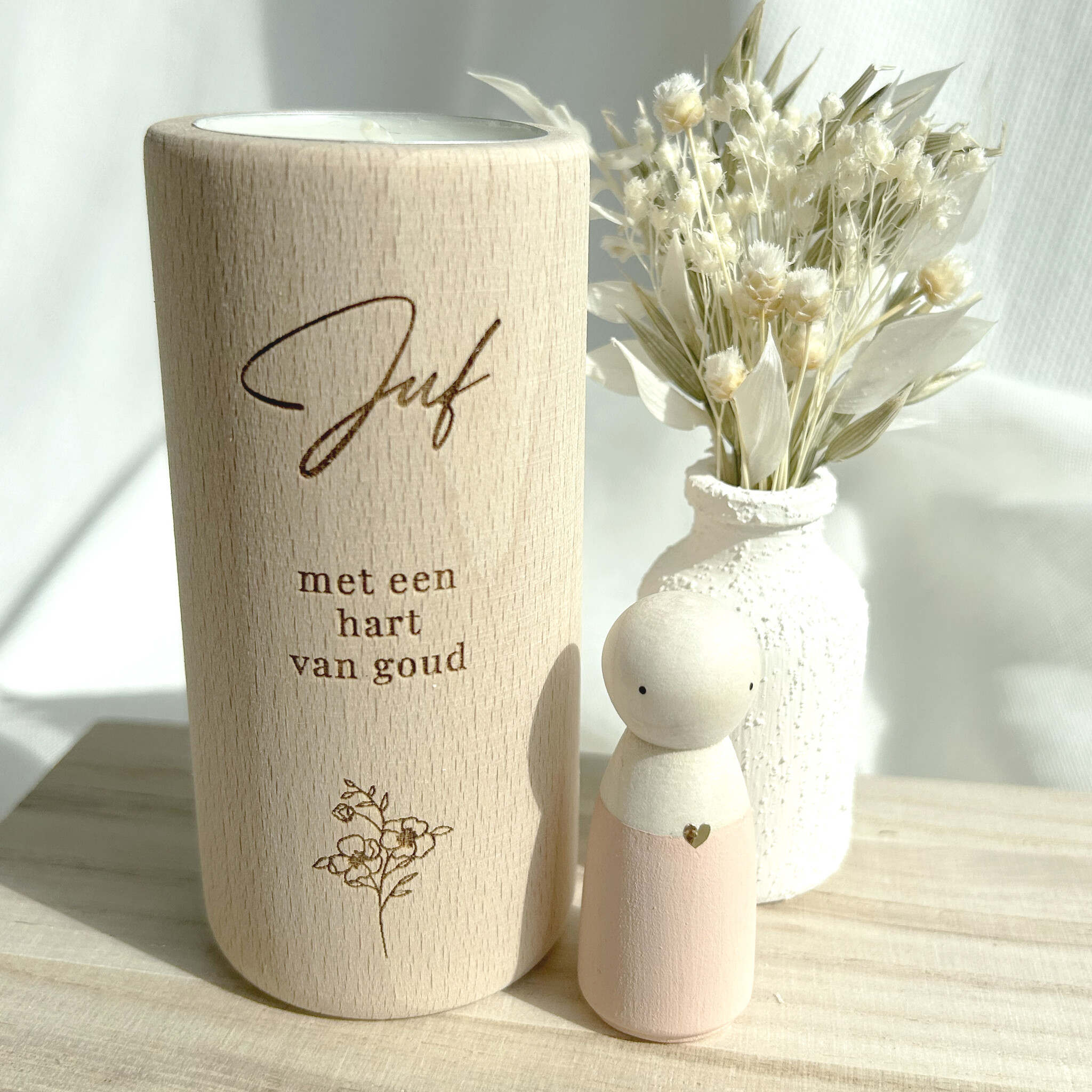Met een houten theelichtje ‘Juf met een hart van goud’, een handgeschilderd poppetje met een gouden hartje en een wit vaasje met droogbloemen – mooi verpakt in een stijlvol cadeaudoosje.
