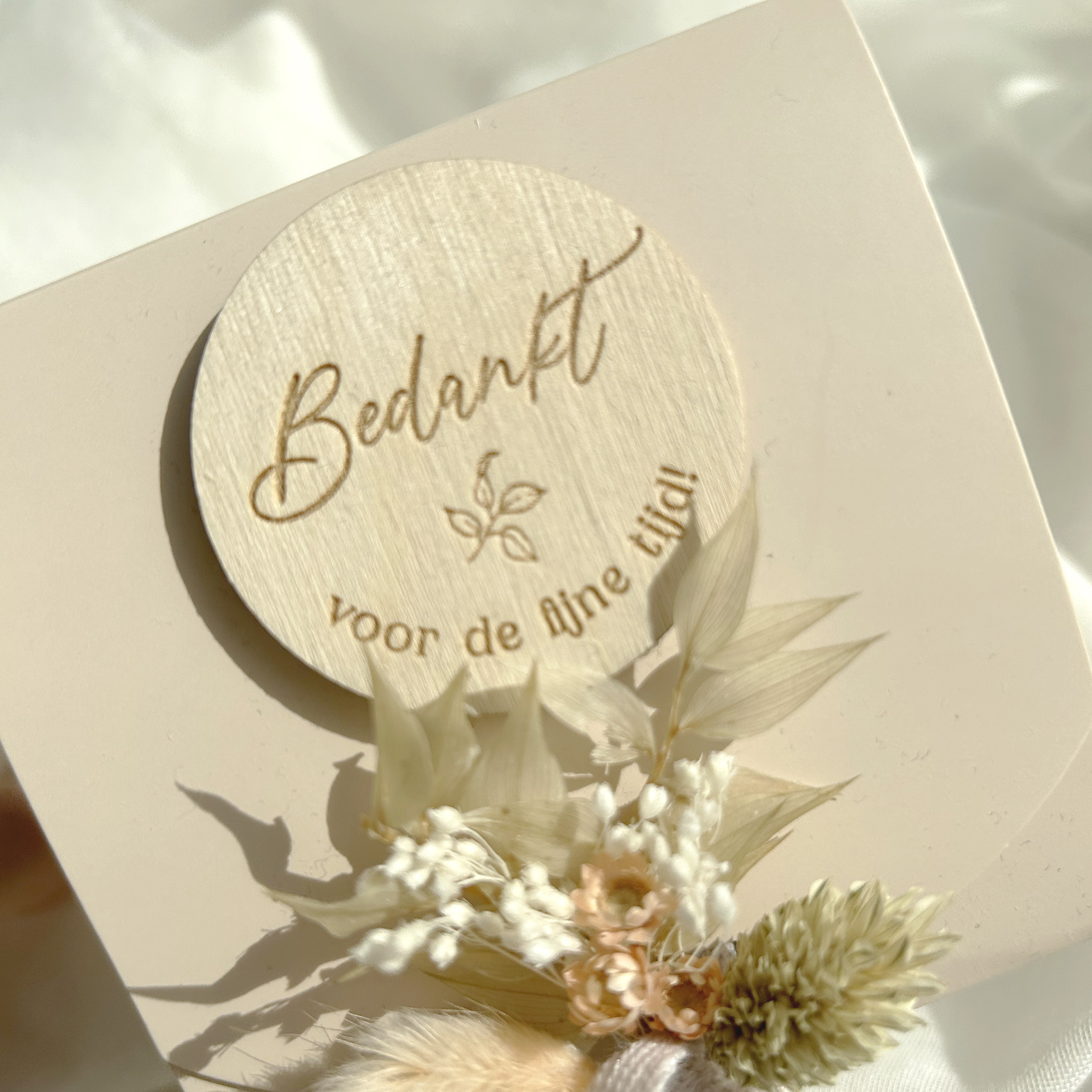 – Een wit, keramisch vaasje gevuld met zachte, neutrale droogbloemen