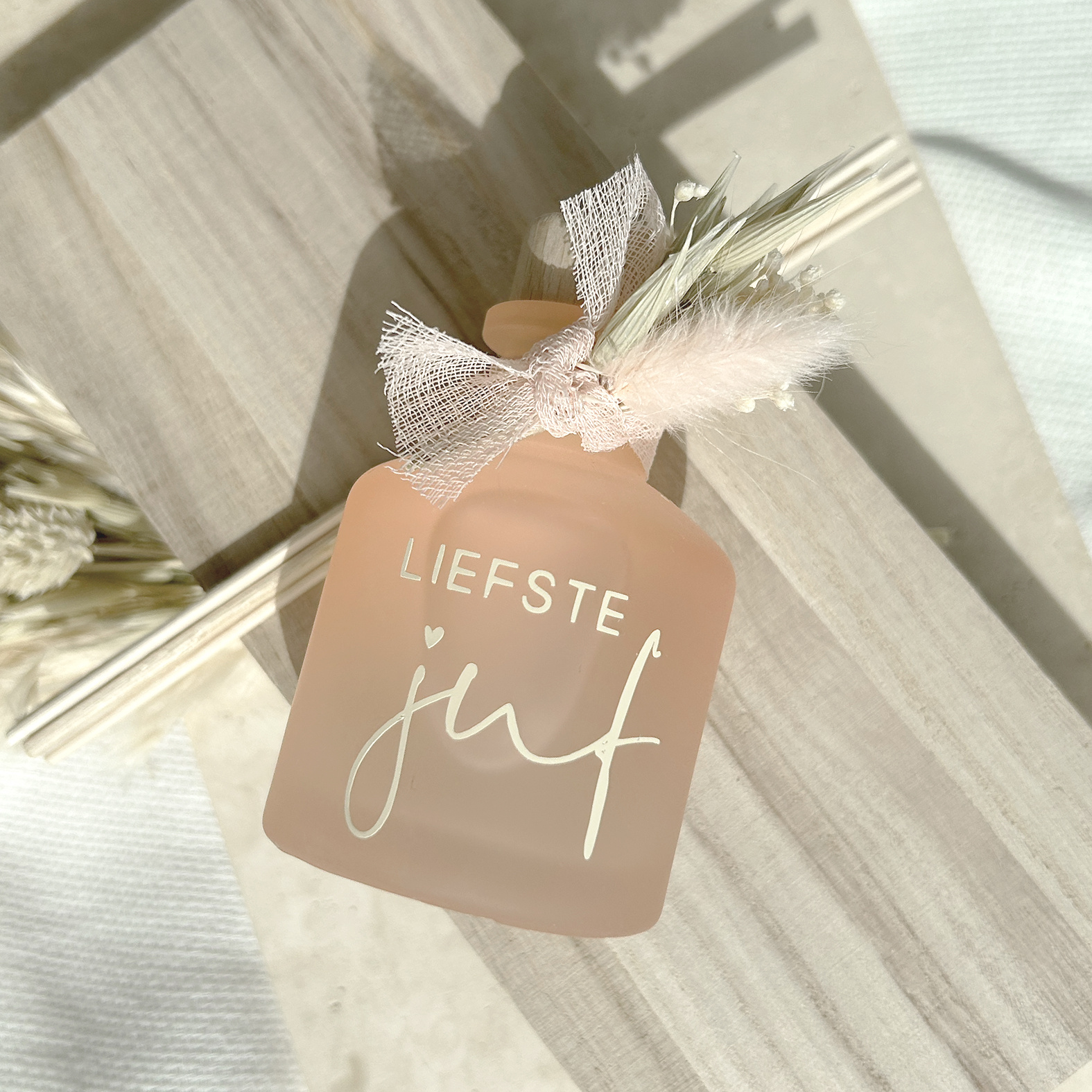 Met de opdruk ‘Liefste juf’, een houten dop, droogbloemetjes en een fijne strik is dit een perfect en stijlvol cadeautje om het schooljaar mee af te sluiten.