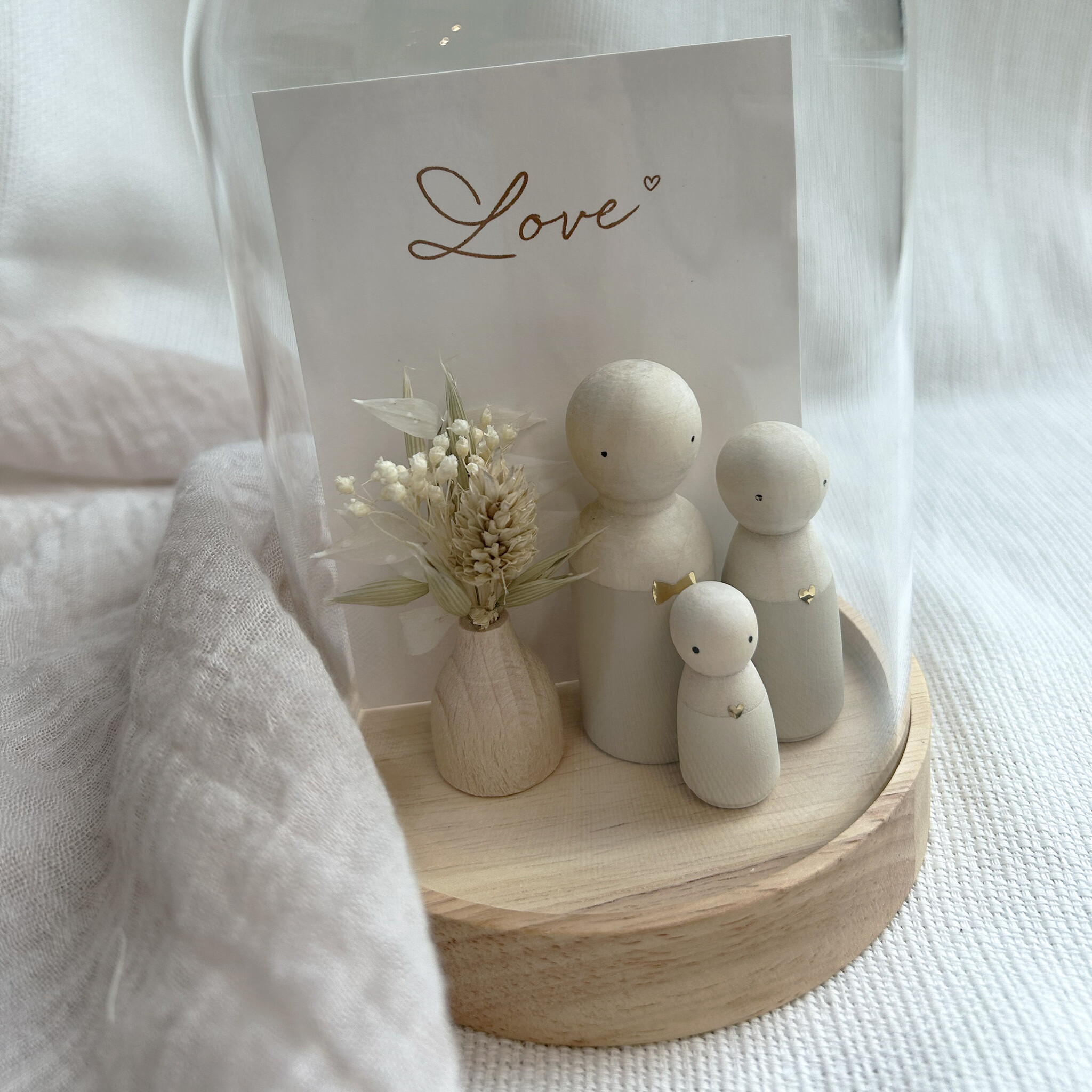 In deze glazen stolp komt je gezin in houten poppetjes extra mooi tot zijn recht! Een kaart met tekst naar keuze is altijd inbegrepen. De houten poppetjes kan je apart bestellen.