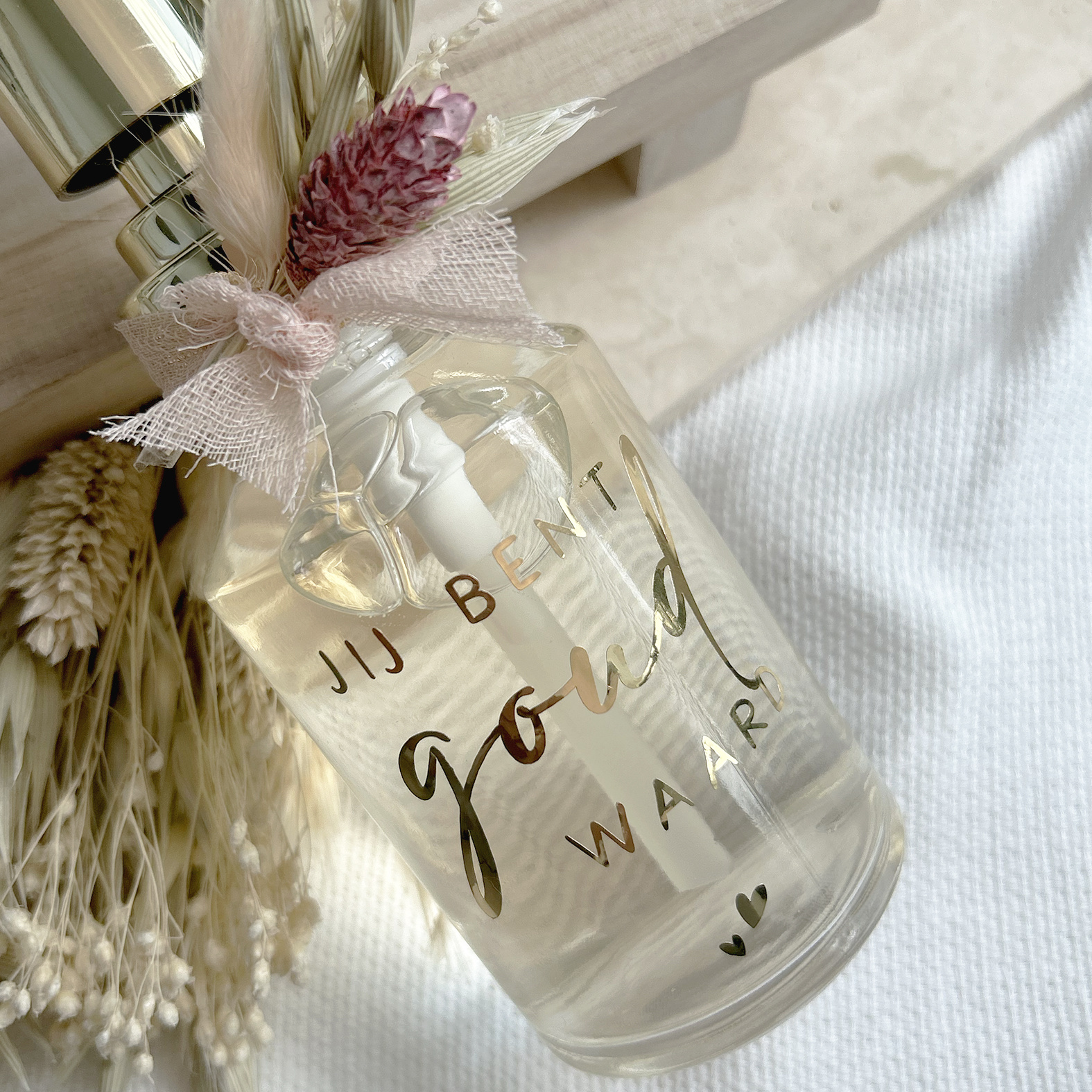 Glazen flesje met gouden pompje en opdruk Lees meer